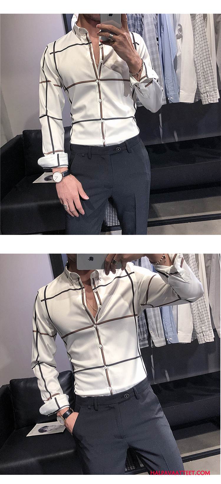 Miesten Paita Verkossa Tiukka Kauluspaida Miehille Ruudullinen Komea Valkoinen