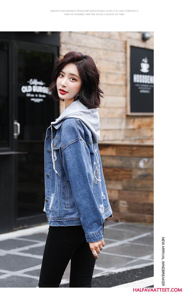 Naisten Farkkutakki Myynti Hupullinen Kirjonta Denimi Lyhyt Syksy Sininen