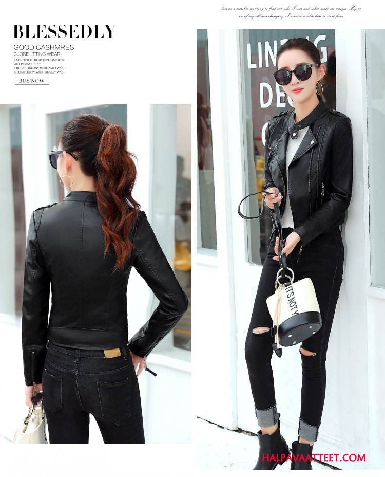 Naisten Nahkavaatteet Osta Korkea Kaulus Tiukka Pitkät Hihat Vetoketju Nahkatakki Puhdas Musta